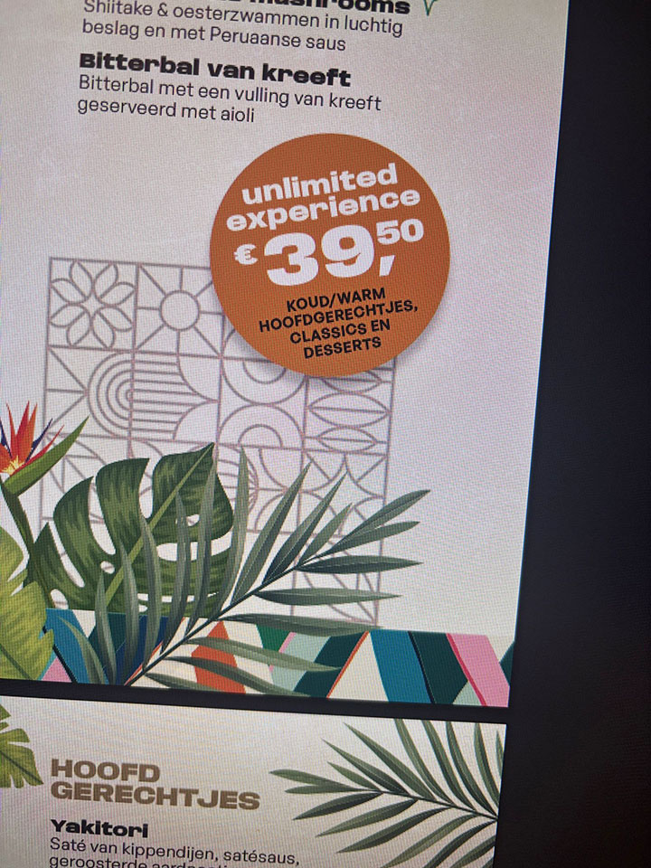 De ‘little gem salad’ had geen jalapeñopepers, zoals belooft op de menukaart, maar gewone rode pepertjes en keiharde, smakeloze stukken avocado. De ‘tartaar van zalm, wasabimayonaise en kroepoek van inktvis’ had helemaal geen kroepoek van inktvis maar een gefrituurd nori-velletje en ik zou het geen ‘tartaar’ durven noemen maar meer een liefdeloos bij elkaar geduwd hapje van restjes zalm.