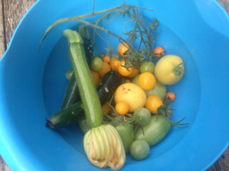 Daarna ga ik de tuin in. De moestuin geeft me nog een paar courgettes en tomaten.