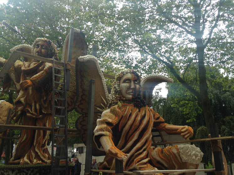Wat een werk, zo’n fruitcorso-wagen! Duizenden zaadjes, allemaal in de goede richting plakken.