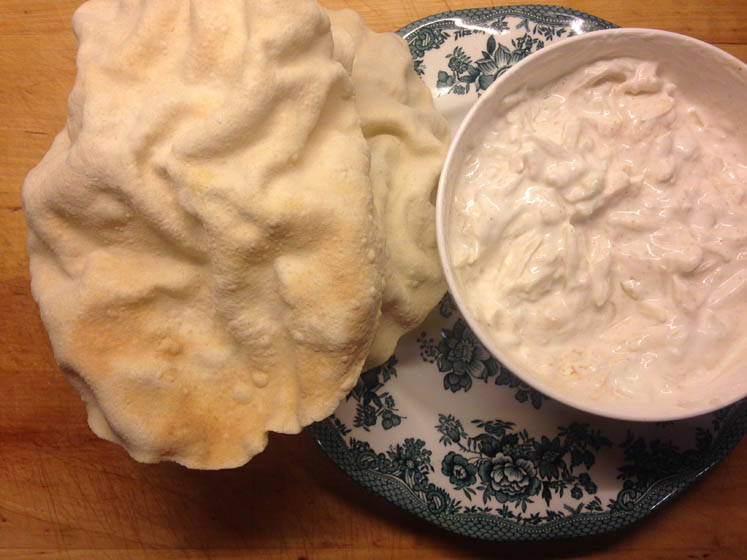 Ik zorg voor een gezonde snack op de bank ’s avonds (pappadums met raita). De pubers zijn weer naar huis en J. en ik hebben een avondje voor onszelf.