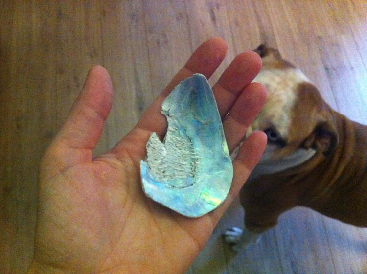 En ik krijg ook een hele zak met stukken Paua schelp! Die kun je dus alleen in Nieuw-Zeeland vinden en zijn echt PRACHTIG! Glimmerdeglim!