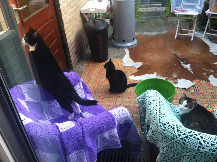 Boys! Boys! Ik sta hier hoor! De poezenboys zijn alle drie zeer blij met de nieuwe stoeltjes onder de overkapping en vinden het nu geen enkel probleem om de hele nacht buiten te blijven. Al willen ze nu wel graag naar binnen, want HONGER!