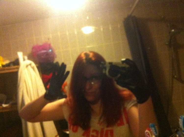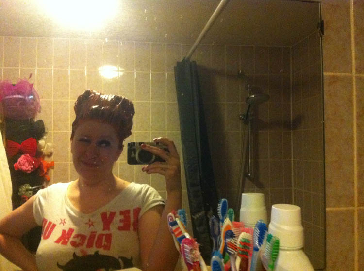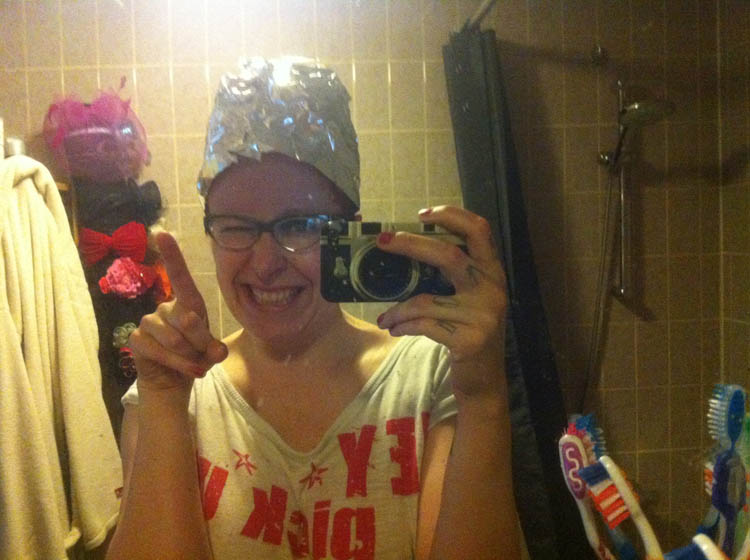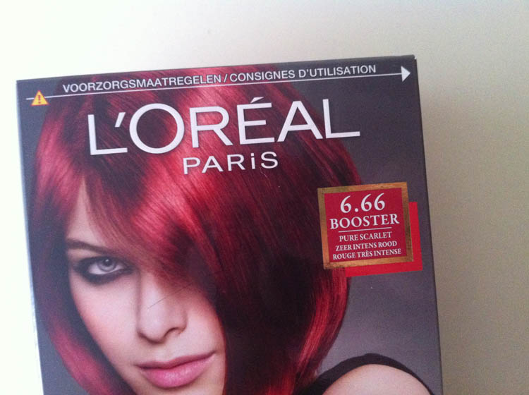 Dit is de voorfoto, maar die is bewogen. Ik heb m’n Dexter-handschoentjes al aan, want zelf je haar verven is dan wel goedkoop, het is ook nogal een bloederige toestand als je met nummer 666 bezig bent.