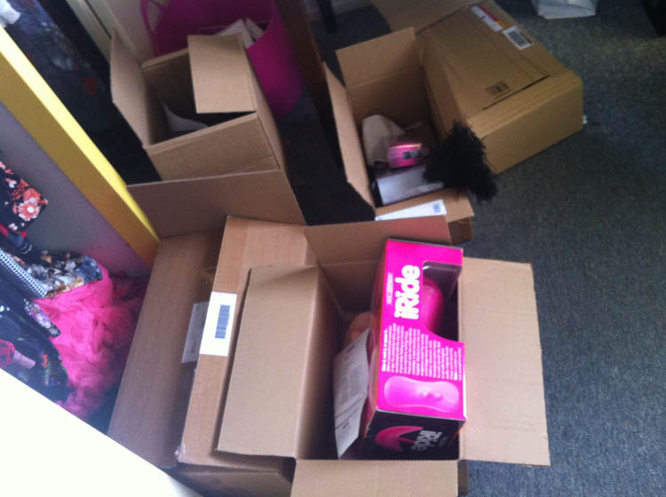 Deze dozen zitten allemaal vol met speeltjes en alles moet nog getest worden.