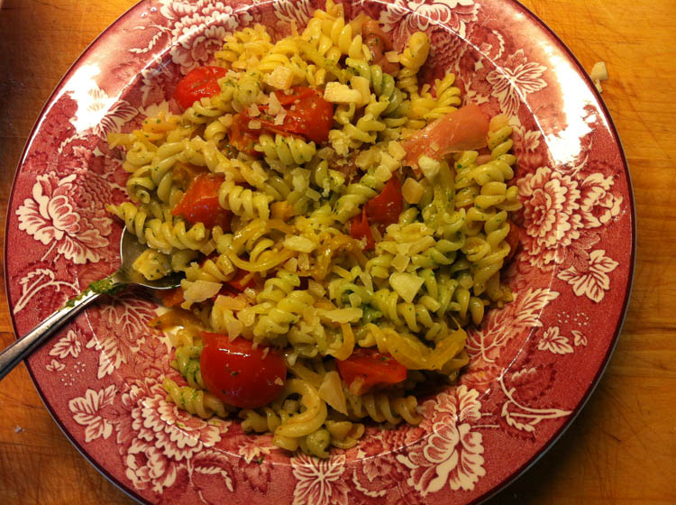Hier missen heel veel foto’s, want ik maakte rucolapesto en met die rucolapesto maakte ik deze pasta voor de lunch. Ik maakte ook een haringsalade en die staat nu in de koelkast. Overal komen de recepten van. Oh, ik maakte ook nog een pastasalade met rucolapesto.