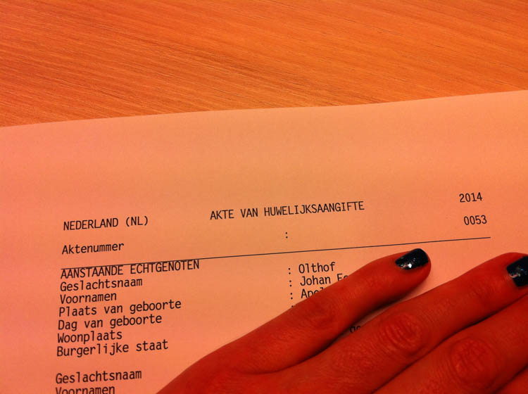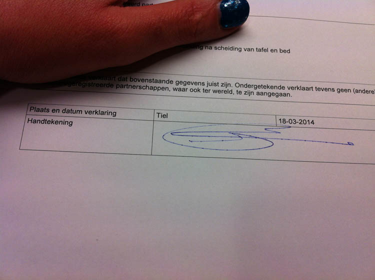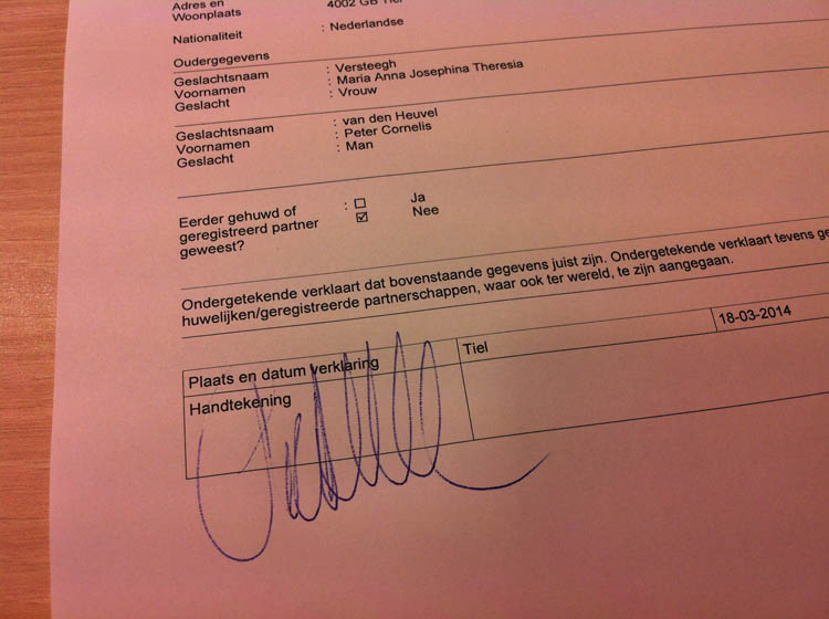 “Wanneer gaan jullie trouwen?”, vraagt de ambtenaar van de burgerlijke stand. Ehhhhhh?? “Moeten we dat nu beslissen dan? Kunnen we niet nu in ondertrouw en dan later een keertje verzinnen wanneer we precies willen trouwen?”, vragen we. Nee, dat kan dus niet. HAHAHA! Je zou toch zeggen dat de verkering hier ervaring mee heeft, want die is al een keer getrouwd geweest, maar we hebben eigenlijk nog niet echt over een datum nagedacht. We wilden vrijdag 13 juni, maar dat kost bijna 600 euro en dat vinden we belachelijk. “Doe maar de eerstvolgende keer dat we gratis kunnen”, zeggen we. Het wordt 18 juni. Prima datum. Lekker ad hoc en ADHD tot stand gekomen. De verkering tekent.
