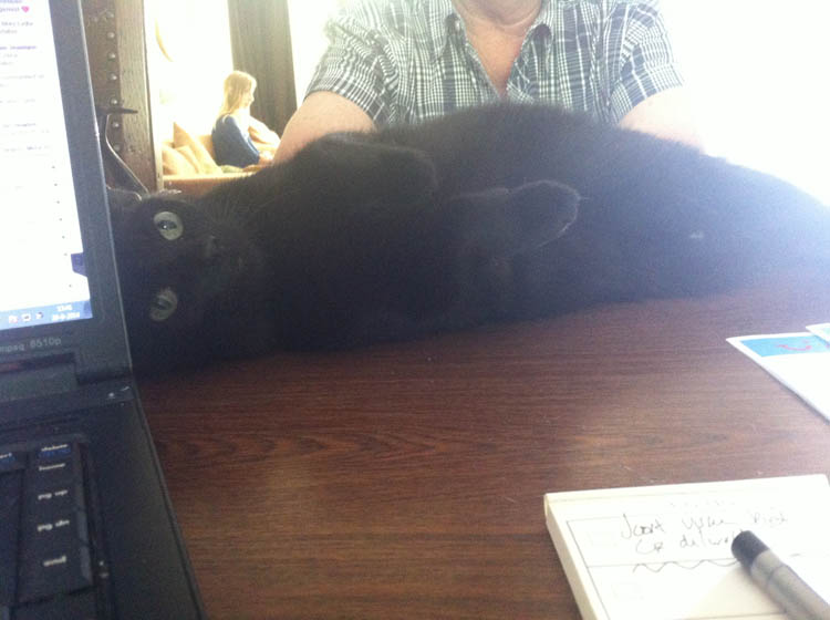 Wat een rotnacht! De echtgenoot en ik zouden zelf gewoon bijna ruzie krijgen om dat hele gezeik met onze Arke-reis naar Jamaica. Ik vind het allemaal zo negatief, zo kut en klote dat ik mijn tijd liever zou besteden aan het uitzoeken van een andere reis. Maar dat is volgens de echtgenoot precies wat ze bij Arke verwachten. Ze bieden een reis megagoedkoop aan, verkopen ‘m en mogen dan, volgens hun eigen richtrijnen, er allerlei toeslagen bij op tellen of de korting veranderen. “Ja, en de meeste mensen betalen die toeslag waarschijnlijk ook nog gewoon”, zegt hij. “Maar dat gaan wij niet doen hoor”, zeg ik. “Nee, wij willen de reis voor het afgesproken bedrag”, zegt hij. En hij heeft ook gelijk. Het is belachelijk wat er gebeurt en het voelt ontzettend oneerlijk. Eikels! Ik stuur in de ochtend wat tweets de wereld in en mijn tweets worden ontelbaar keer geretweet! Ook tweeten followers, maar ook weer followers van followers (I <3 twitter) berichtjes naar @arke om ze te wijzen op hun werkelijk belachelijke gang van zaken. ‘Hallo @Arke, Slager Jansen: Ik heb u de runderhaas gisteren te goedkoop verkocht. Maar u kunt wel slavinken krijgen voor uw etentje.’ ‘@Arke: Zal toch wat zijn als Albert Heijn dit doet… ‘nee de asperges zijn ruim 1/3 duurder. Ik kan u een komkommer aanbieden?’ HAHAHA! Het voelt enorm fijn dat we niet alleen staan in onze ‘strijd’ en dat we in ieder geval een kleine twitterstorm hebben kunnen veroorzaken. Gisteren heb ik ook een berichtje gekregen van Joyce… Haar verkering, man, relatie, partner, vriend, is advocaat en hij is ons aan het helpen. Hij duikt in alle regelgeving en wetten en kleine lettertjes. HOERA!!! En ik word deze ochtend ook nog bijgestaan door kater Bruce op schoot.
