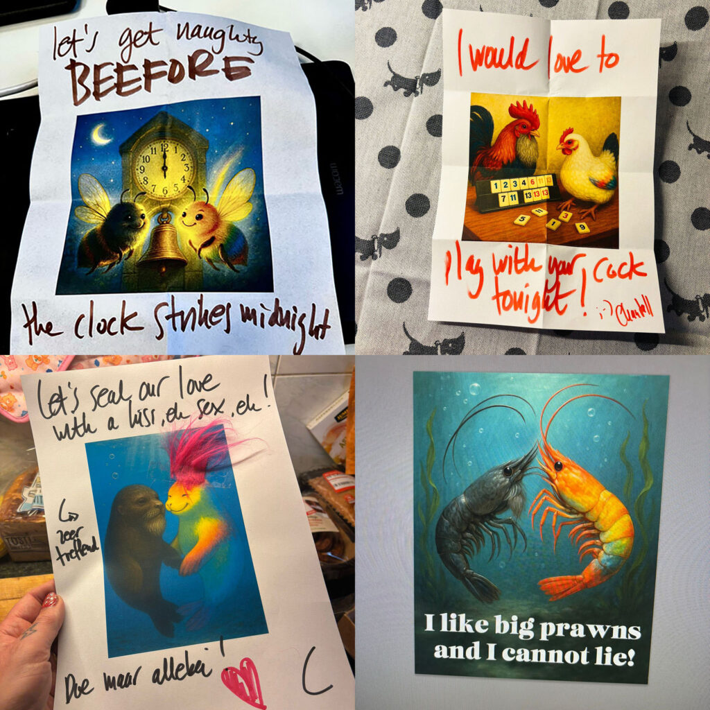 Het is mijn kleine missie om hem zich tijdens de lunch óf heel verliefd, geliefd, geil, óf juist heel ongemakkelijk te laten voelen tussen z’n collega’s. Ik hoop, en weet, dat hij iedere keer moet lachen als hij z’n broodtrommel openmaakt, want hé, welke man krijgt er nou een broodtrommel mee naar het werk met een pluche haantje met een briefje ‘I like your cock’?. Niemand! Behalve Ruud dan. Ik weet dat hij daarna het liefst zo snel mogelijk naar huis komt. En ik wil graag dat hij thuiskomt.