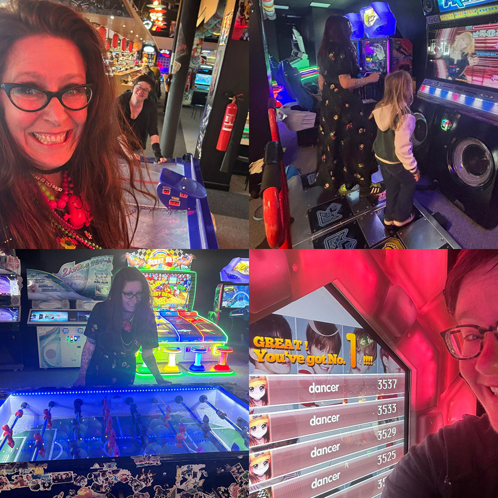 We krijgen hulp van een meisje van een jaar of 8 dat ons een aantal spellen uitlegt en die langs de zijlaan naar ons roept dat we goed moeten kijken naar welke kleurtjes op het scherm verschijnen. We doen een soort dansspel, waarschijnlijk Dance Dance Revolution. We staan op een platform en moeten met onze voeten de gekleurde pijlen volgen in de juiste volgorde op de muziek. Uiteraard is dit een niet te volgen liedje van een Japanse girlband, die we geheel per ongeluk uitkiezen, want we snappen geen reet van hoe alles werkt. We doen maar wat. En vriendin I. is een vrouw die niet danst. Die ik in al onze jaren vriendschap, toch zeker meer dan 35 jaar, nog nooit heb zien dansen. Maar m’n vriendin fanatiek zien trappelen op een gele pijl; priceless, fucking priceless!