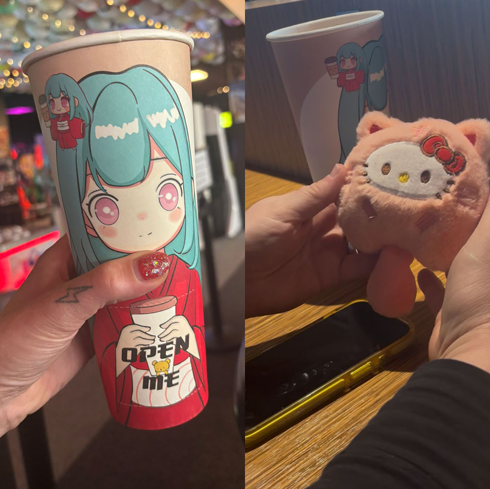 “We gaan naar Molly’s Arcade en daar gaan we een Mystery Cup halen. Een drankje met onderin een pluche kawaii-ding en die reclame kwam zo vaak voorbij op m’n Instagram dat ik aan niets anders meer kon denken. Ik wil het. En jij ook.”
