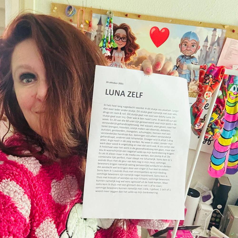 Zo’n 30 jaar geleden, tijdens mijn Grafische MTS-opleiding, begon ik met vrijwilligerswerk op een afdeling voor mensen met dementie in Amersfoort. Beetje zingen, beetje spelletjes spelen, helpen met eten. Omdat er een groot tekort aan personeel was, werd me gevraagd of ik in de vakantieperiode op de afdeling wilde komen werken. Voor het echt. Voor geld. Die maanden leerde ik mensen uit bed halen, wassen, knippen, drogen, douchen, naar het toilet. Ik leerde voor mensen te zorgen. Die maanden heb ik een groot respect voor het menselijk lichaam gekregen. Voor de menselijke geest. Voor de mens. Ik voelde daar zoveel liefde. En ik leerde dat ik heel veel liefde te geven heb. En dat ik, ondanks m’n ADHD, of misschien wel dankzij, een enorm geduld heb als ik voor mensen zorg.