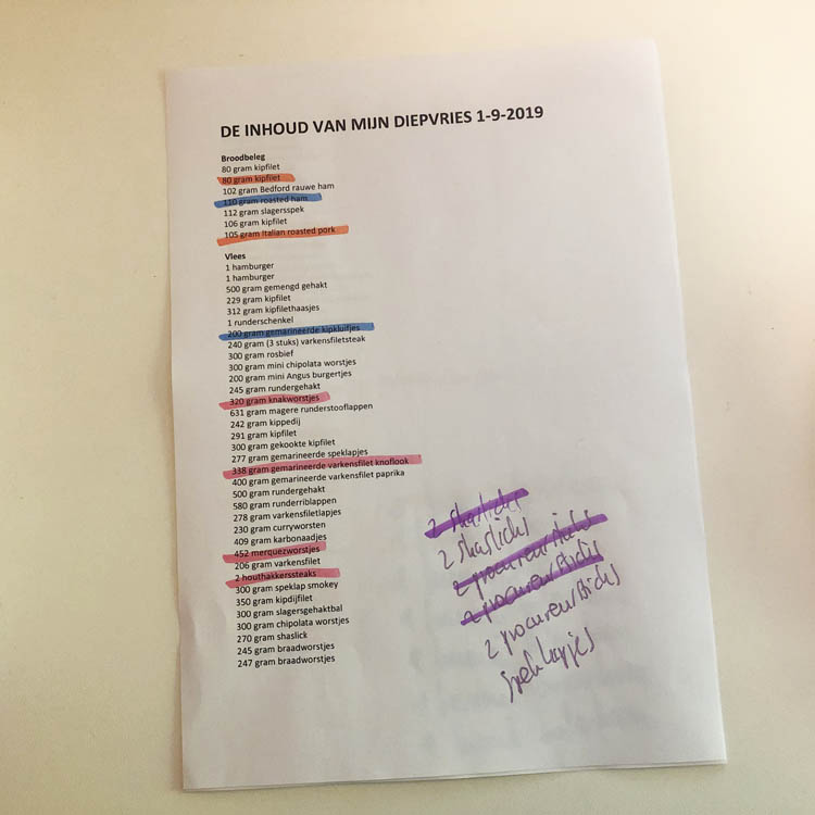 Zondag 1 september heb ik alles uit de diepvries gehaald, eventueel gewogen en daarna genoteerd. Het was even werk en het was behoorlijk gênant, want nogal een confrontatie met m’n eigen hoard-gedrag, maar ik heb nu een lijst met alles wat in de vriezer zit. En ik moet zeggen; had ik jaren eerder moeten doen!