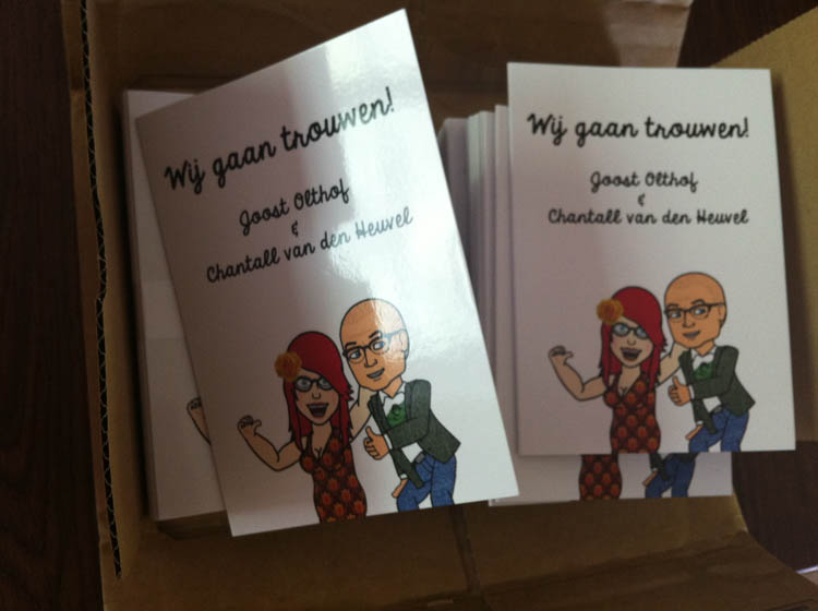 De trouwkaarten komen binnen! Nu al! SCORE! En helemaal gelukt, dat is vooral fijn! Komt toch mooi van pas, die grafische achtergrond!