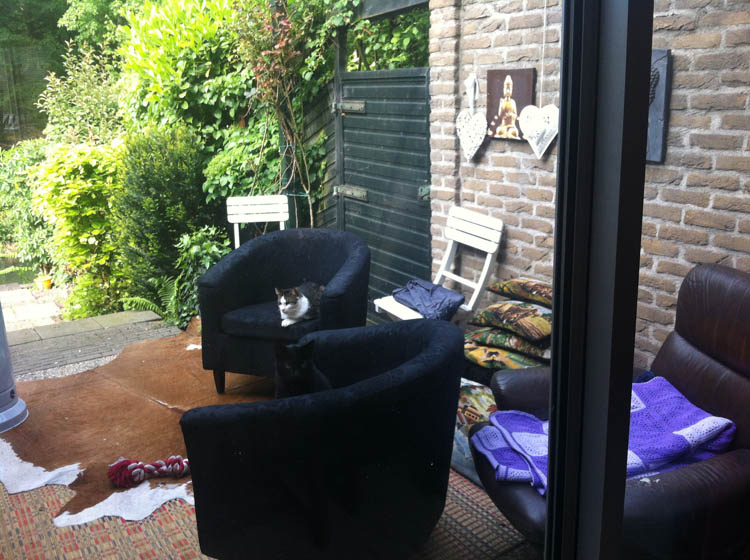 Hahaha, tuurlijk poezenboys! Mijn ouders hebben nieuwe stoeltjes gekocht en wilden deze oude stoeltjes weggooien. Dat is natuurlijk zonde! Wij zetten ze graag onder onze overkapping, zodat we, samen met de heater, het hele jaar door buiten kunnen zitten. FIJN! De poezenboys hebben de stoeltjes meteen even ingewijd met wat kattenhaar toen de verkering en ik met Nina naar het bos waren.