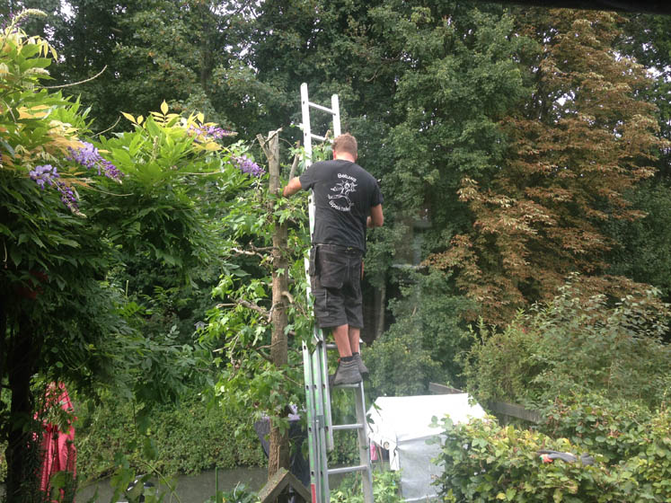 Vriend A. komt even onze boom snoeien, want de duiven zijn eindelijk uitgevlogen. Van de rest van de avond zijn geen foto’s, want er was nogal gedoe met de oppaspuber, waardoor niemand een heel prettige avond en nacht heeft gehad. Morgen weer een dag.