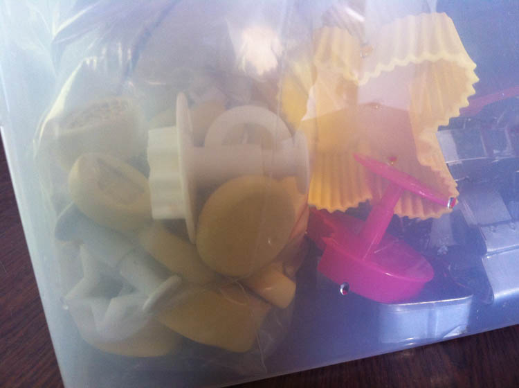Thuis eten M. en ik een broodje en dan ga ik al m’n bakspullen opruimen. Ik heb 6 bakken met van alles.