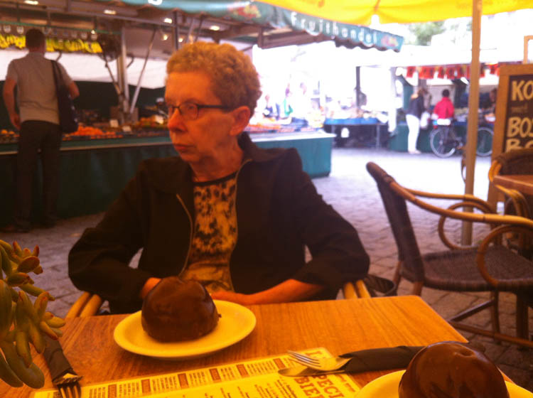 We eten een Bosche bol met een kop koffie op een terras en moeten 25 euro afrekenen. Nu ben ik geen zeikerd (jawel, dat ben ik wel), maar ik vind dat echt een hoop geld en je mag niet terugrekenen (jawel, dat mag wel), maar dat is omgerekend dus 60 gulden! Maar goed, het was dan ook wel een HELE lekkere Bosche bol. Dat dan weer wel.