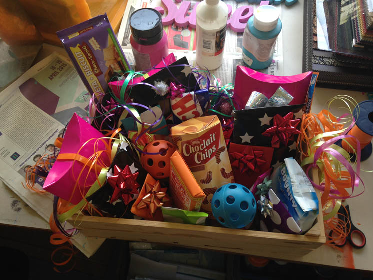 Daarna pakken M. en ik de cadeautjes voor een buurvrouw in en doen ze in een mandje.