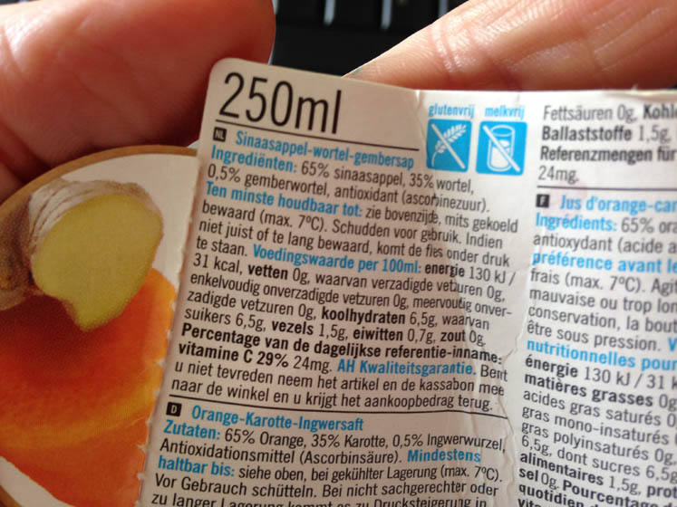 Ja, doei, wat een oplichterij; 0,5% gemberwortel! Je proeft het niet eens. Verder wel lekker overigens, maar ik hou juist zo van de smaak van gember.