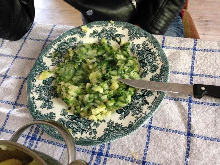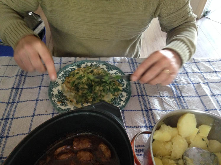 Oppaspuber M. is weer richting huis en dochter S. is weer gearriveerd! We eten andijvie met verse worst (die ik in stukken heb geknipt, want zo zijn ze sneller gaar).