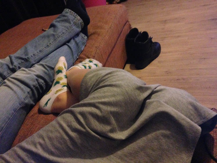 Dochter S. is gezellig tussen ons in gekropen op de bank… niet omdat ze zoveel van ons houdt, maar omdat haar telefoon anders niet kan opladen…
