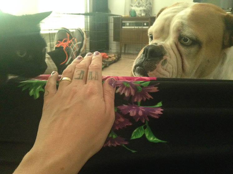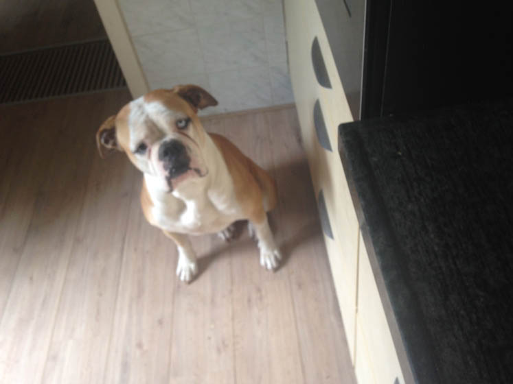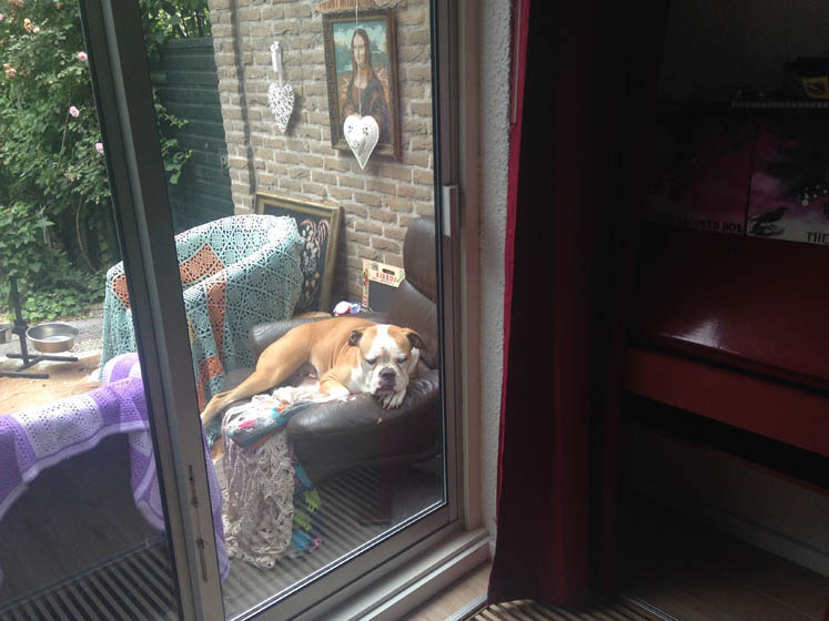 J. en ik razen huishoudelijk even door het huis heen en Nina moet buiten wachten tot de vloer weer droog is.