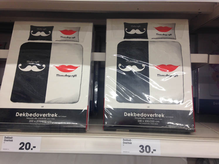 We gaan op pad en op zoek naar zo’n elektrische vliegen-frituur, maar die is nergens te koop. Volgende keer maar gewoon een vliegengordijn kopen dan. Bij de Kwantum ligt dit dekbed. Ik vraag me af of het overal zo is dat de vrouw rechts slaapt en de man links. Is bij mij wel altijd zo geweest.