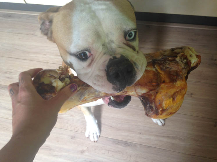 Nina krijgt een bot. Is ze heel blij mee.