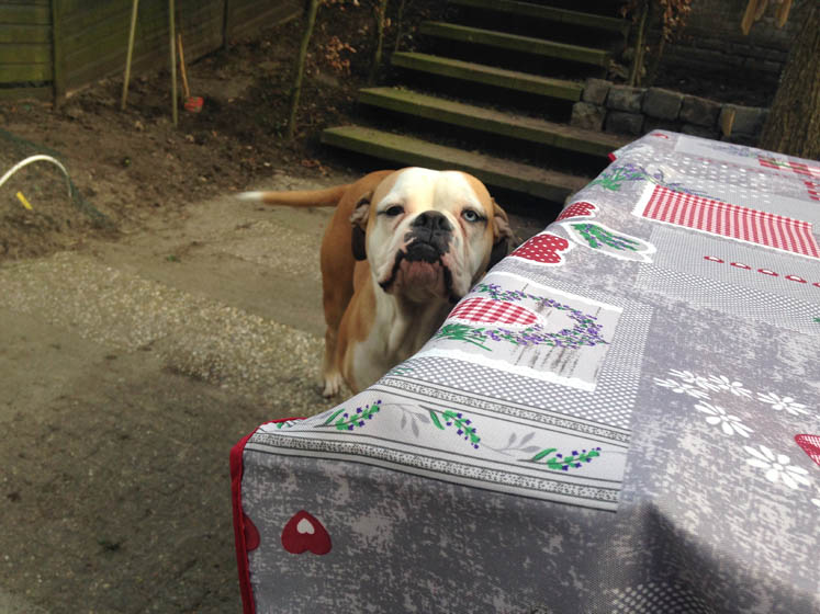 Dankzij deze dame. Die had dus gisteren aarde (en wat er nog meer in kan zitten) gegeten uit de tuin en daardoor heeft ze vannacht zo rond 2:00 de hele slaapkamer onder gescheten. En daardoor moest ik dus ’s nachts in m’n halve nakie in de schuur op zoek naar handschoenen en een emmer met sop en DRAMA! En aangezien Nina een hond is van 40 kilo kun je je misschien ook wel een voorstelling maken van de hoeveelheid diarree die daarmee gepaard is gegaan. En… aangezien mijn lieftallige echtgenoot niet tegen de geur of aanblik van andermans poep of stront kan heeft hij zich daarna volledig leeggekotst. En… aangezien Nina voor de deur had gepoept en J. in een vlaag van kotsverbijstering de deur opentrok om naar de wc te rennen werd de poep helemaal uitgesmeerd. En dat mocht ik allemaal opruimen. Daarna heb ik niet meer geslapen. Groots en meeslepend leven!