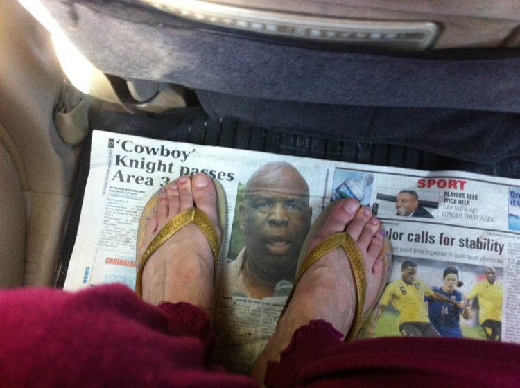 Terwijl ik met m’n voeten op het hoofd van deze man zit.