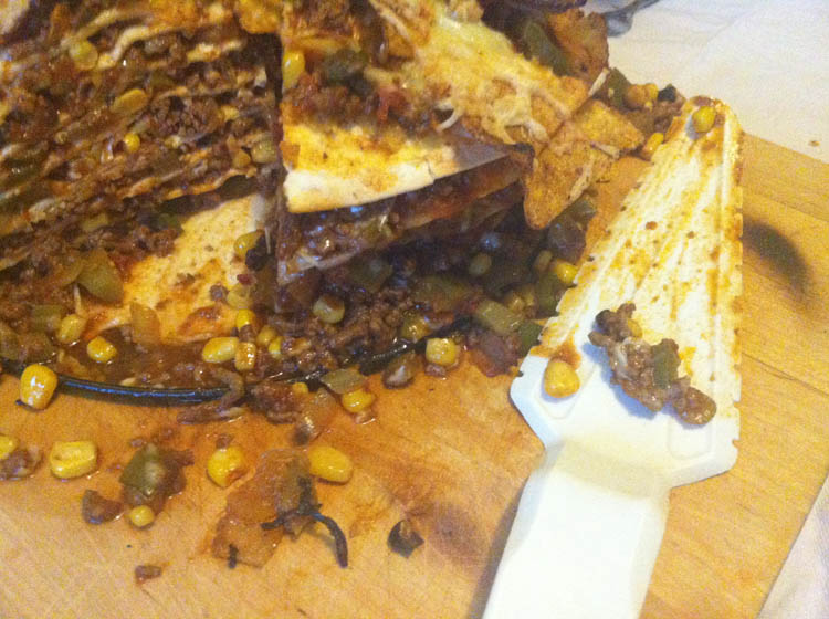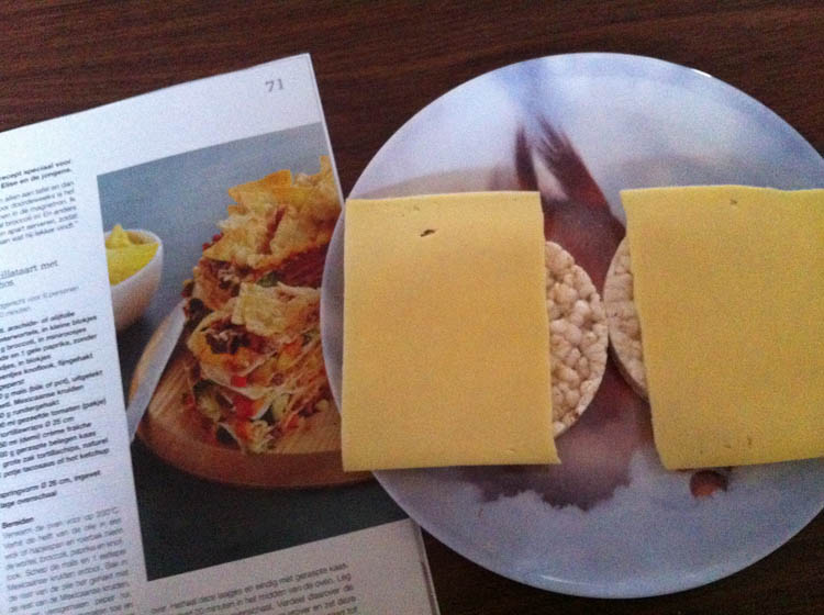 Ik eet 2 rijstwafels met kaas, maar voel me veel meer aangetrokken tot het plaatje in het tijdschrift links; een tortilla-taart.