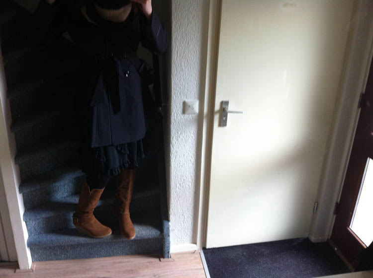Toch nog bijna 4 uur enigszins non-stop gewerkt. Hier doe ik een poging om m’n nieuwe jas en nieuwe schoenen te showen. Ik ben er heel blij mee en ik was echt aan een nieuwe jas toe. Deze kan ook over een jurk met petticoat en ja, die had ik echt nodig, want een lange jas over een petticoat, dat gaat dus niet. Nou ja, dat gaat dus wel en het is jaren goed gegaan, maar het ziet er niet uit.