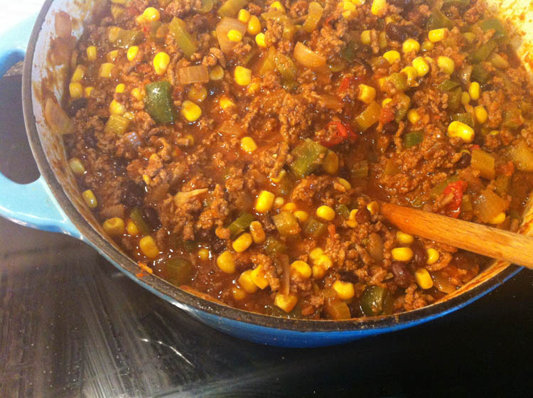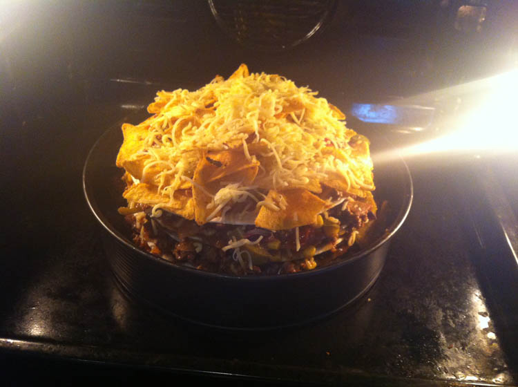 Ja, die tortilla-taart die ik vanmorgen in dat tijdschrift tegenkwam, die wilde ik natuurlijk meteen maken. Hier staat hij net in de oven.