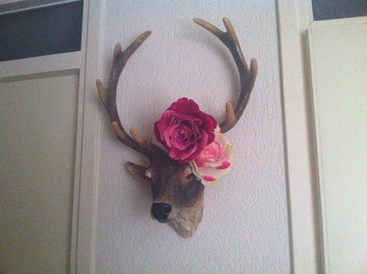 Dit hert kreeg ik meer dan 4 maanden geleden van mijn lieve schoonmoeder. Dit hert heeft VIER maanden voor de kledingkast van de verkering gelegen als een soort van reminder dat hij ‘m voor me op moest hangen. En sja, die lag daar vanmorgen nog. Dus ik heb ‘m zelf maar opgehangen. “Heb je niet in de gaten gehad dat er een hert voor je kledingkast lag?”, vraag ik ’s avonds aan de verkering. “Nee.” “Dat hert dat ik van je moeder heb gekregen?” “Nee.” “Maar die zou jij toch ophangen?” Wist-ie niks meer van. “Maar vindt je het ophangen van een hert niet een typische mannentaak?” “Schatje, het schieten van een hert is een typische mannentaak. Een nephert ophangen is geen mannenwerk.” Oh. Okay. Nou, dan wordt het een hert met roosjes.