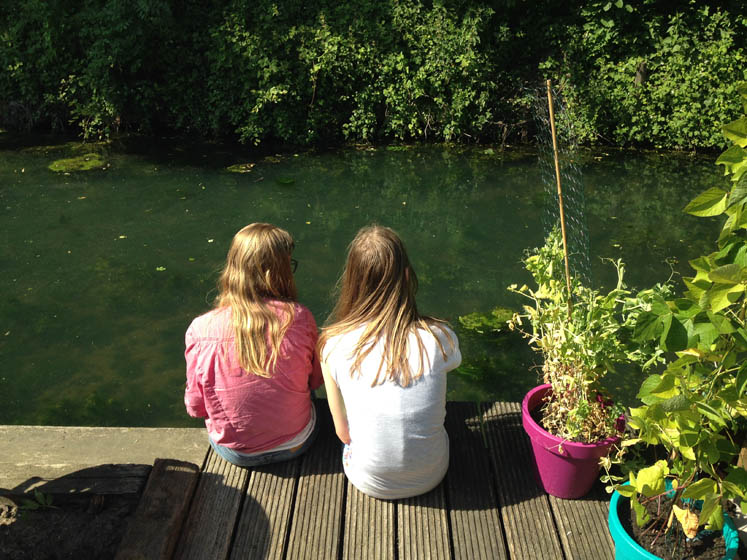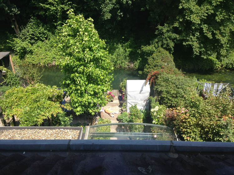 Dit is onze tuin vanaf m’n atelier gefotografeerd… zoals je ziet ligt Nina in de zon!