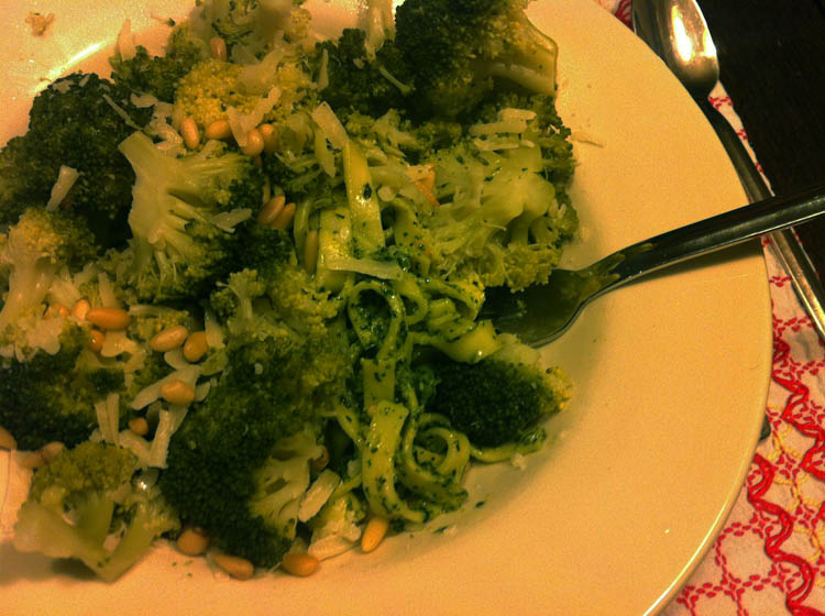 Kijk eens aan! Een complete maaltijd met verse pasta, zelfgemaakte pesto, geroosterde pijnboompitjes, Parmezaanse kaas en dus broccoli.