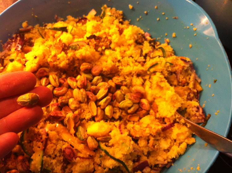 Ik maak een XXXL bak met couscous-salade. Voor vandaag, voor m’n ouders en voor morgen. Hmmm…