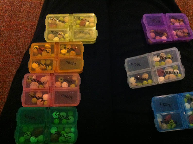 J. brengt de meiden weer richting Apeldoorn en ik begin aan de voorbereidingen voor m’n HEALTY WEEK! Hahaha… Ik doe m’n vitaminepillen in m’n regenboog-medicijndoosje. Goed bezig!