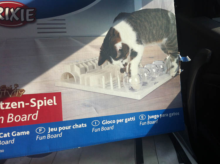 We kopen een cadeautje voor de poes van vriendin M., want M. is jarig. Vandaar dat we in Venlo zijn. Vriendin M. kreeg overigens zelf ook een cadeau, maar haar bloemen vallen gewoon volledig in het niet bij het cadeau voor de poes.