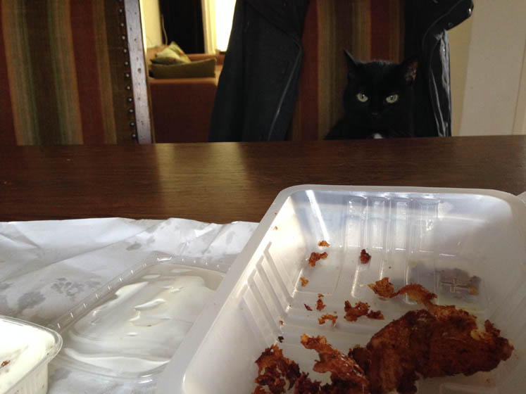 En jij krijgt ook niks. Of nou ja, een heel klein flintertje kabeljauw. Gelukkig was oppaspuber M. net op tijd thuis om ook nog wat stukken kibbeling mee te scoren.