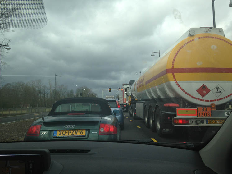 Om daar meer dan een half uur stil te staan in een file die helemaal niet nodig was, want incompetente verkeersregelaars.