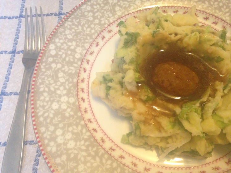 Thuis eten we stamppot rauwe andijvie met een gehaktbal.