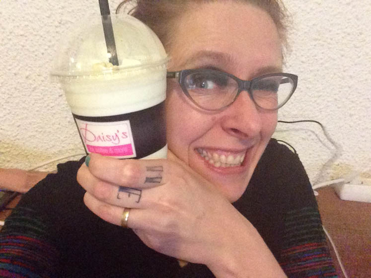 En J. haalt met de meiden het toetje bij Daisy’s! Hmmmm! Ijskoffie met witte chocolade en heel veel slagroom!