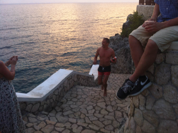 OMG! Dit is T.! En hij maakt gewoon een extreem professionele duik!!!!!! Aaargh! Geweldig! En gelukkig heeft hij er niks aan overgehouden, want ik zit net een beetje te Google-en en lees dat er talloze gewonden en zelfs doden bij dit café zijn gevallen tijdens het klifduiken!!