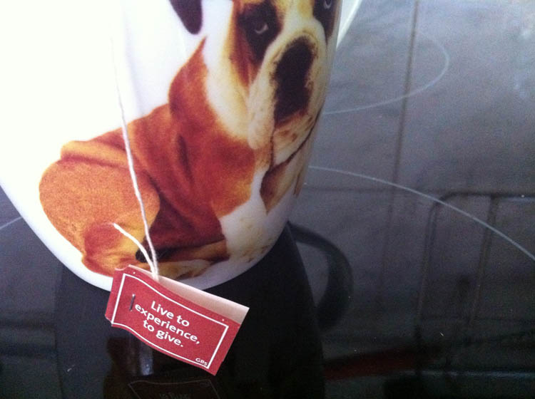 Kopje thee erbij. Wat is dat toch met al die theemerken die van die diepzinnige spreuken aan hun theelabels hangen?