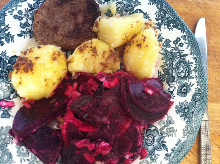 Hmmm… salade van rode bietjes met geitenkaas en aardappeltjes en een hamburger.