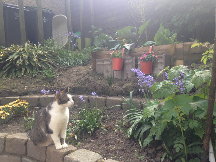 Deze kant van de tuin staat niet zo vaak op de foto, want niet zo fotogeniek (er moet nog wat in en uit aan die kant). Frank is wel heel fotogeniek en ligt de afgelopen dagen vaak bij de buren in de tuin te genieten van alle aandacht. Buurmeisje M. heeft Frank omgedoopt tot Henk, want ze kan nog geen ‘frank’ zeggen, hahaha!