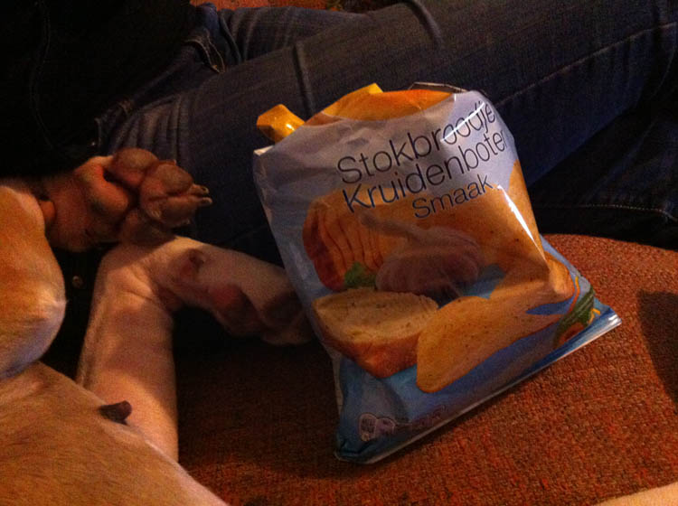 Hier ligt Nina nog steeds tegen F. aan. En ik heb heus, nee, echt, heus, maar een klein handje van deze chips gehad. Ik bedoel; stokbroodje-kruidenboter-smaak!!! Wie verzint dat?? Ik niet! Maar ze waren best lekker. Dat kleine handje dan hè?
