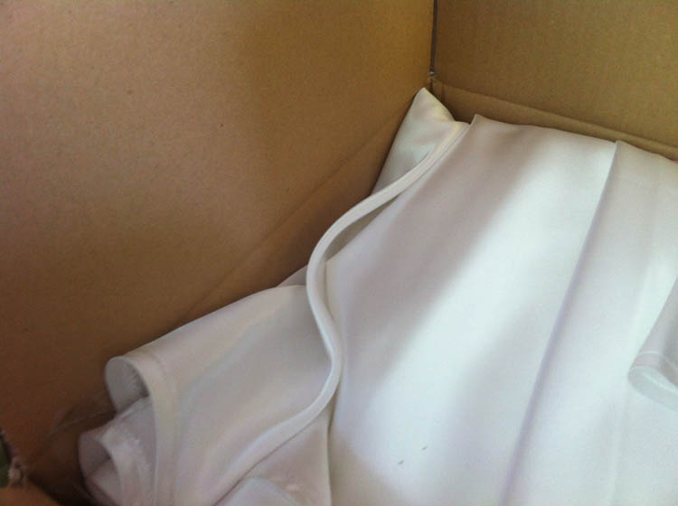 M’n trouwjurk wordt bezorgd en ik pas ‘m niet. Hij is TE GROOT! Het is een 42 en hij zou gewoon moeten passen, maar ik zou zo ongeveer 5 cupmaten erbij moeten hebben wil ik het bovenlijfje een beetje vullen. KUTZOOI! AAAAARGHHHH!!! Dit is echt stom!!! Ik ben gisteren een paar uur bezig geweest met het zoeken naar een perfecte trouwjurk die ik zelf gemakkelijk kan eh, pimpen. En nergens zijn witte jurken te koop. Ja, er zijn wel witte jurken, maar niet die ik bedoel.