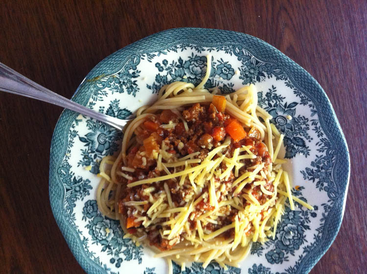 We eten spaghetti met spaghettisaus uit de diepvries en die was HEERLIJK! Dochter S. is inmiddels ook weer thuis en vindt ‘m ook superlekker.